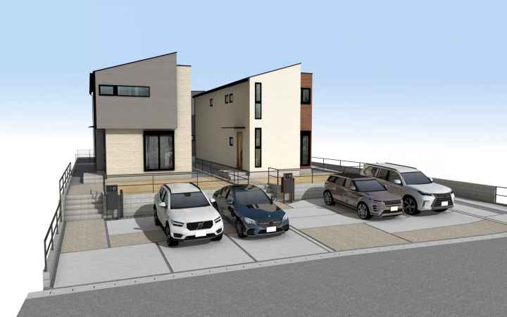 並列駐車3台可能!保育園・スーパー・小学校・薬局が徒歩10分圏内にあります。各棟に庭を配置しているので、休日にBBQをしたりガーデニングを楽しめます。