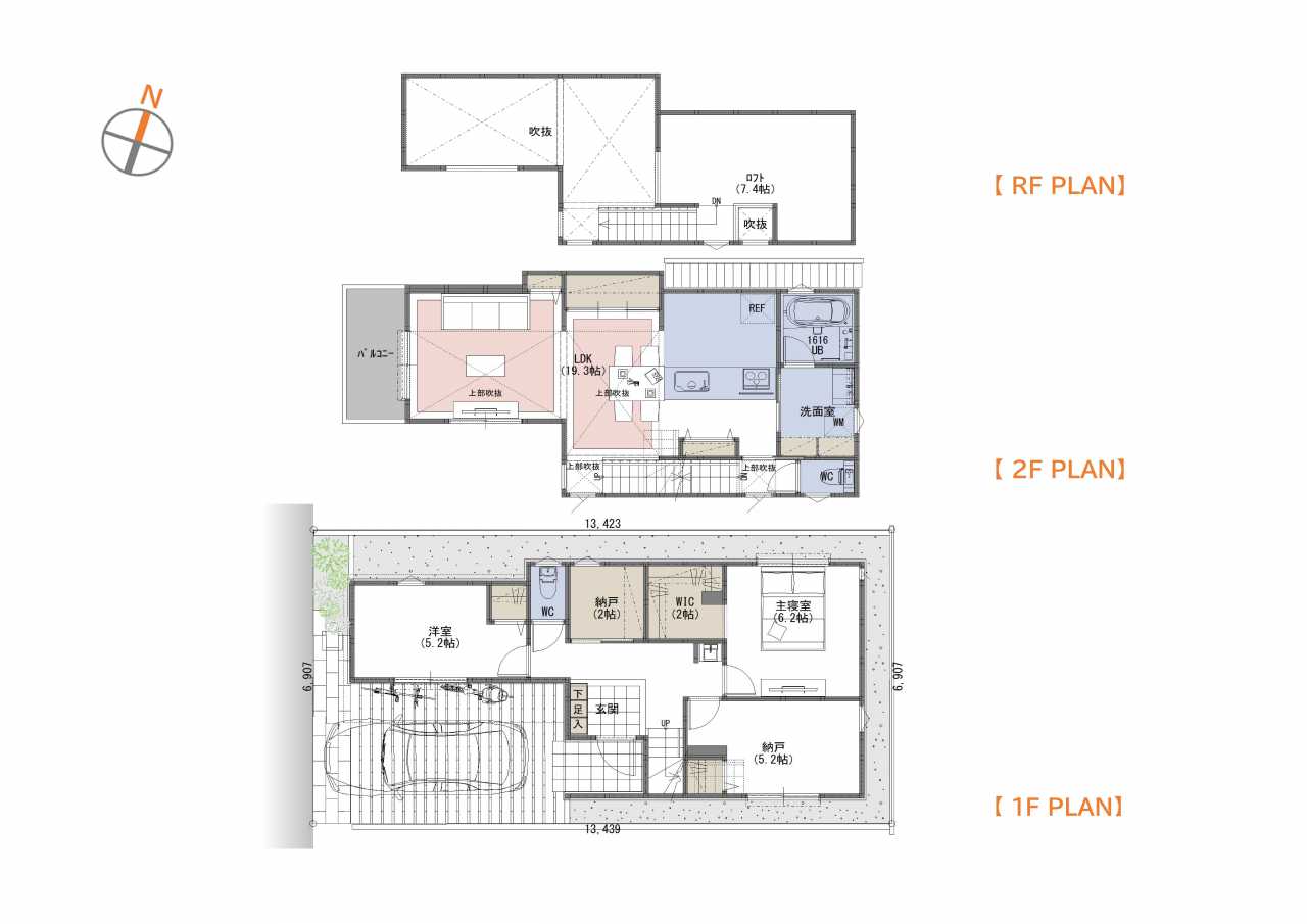 WIC、洗面収納、各居室収納など生活スタイルに合わせて住環境を確保